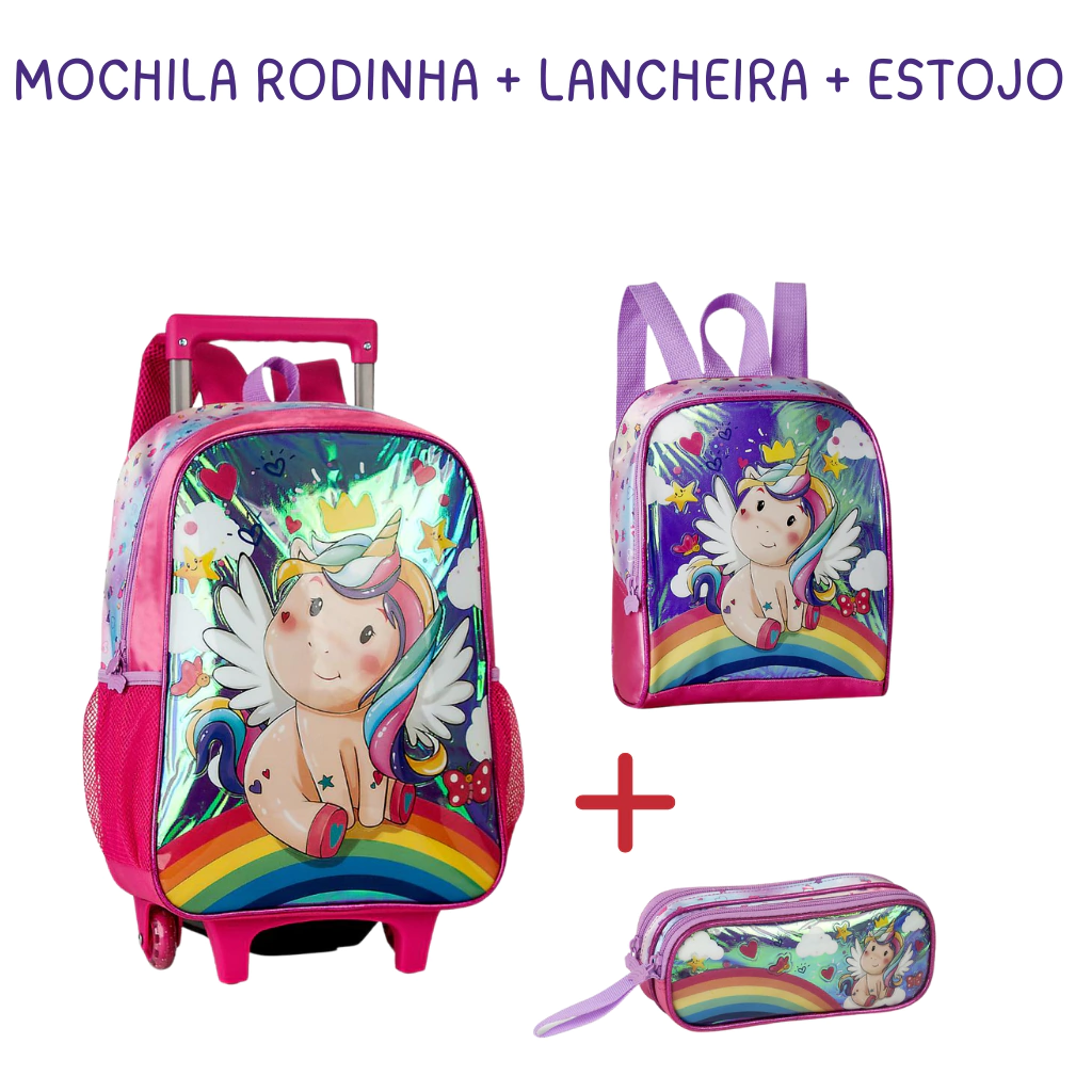 Kit Infantil Escolar composto por: Mochila Infantil com Rodinhas, Lancheira e Estojo com fundo em Glitter