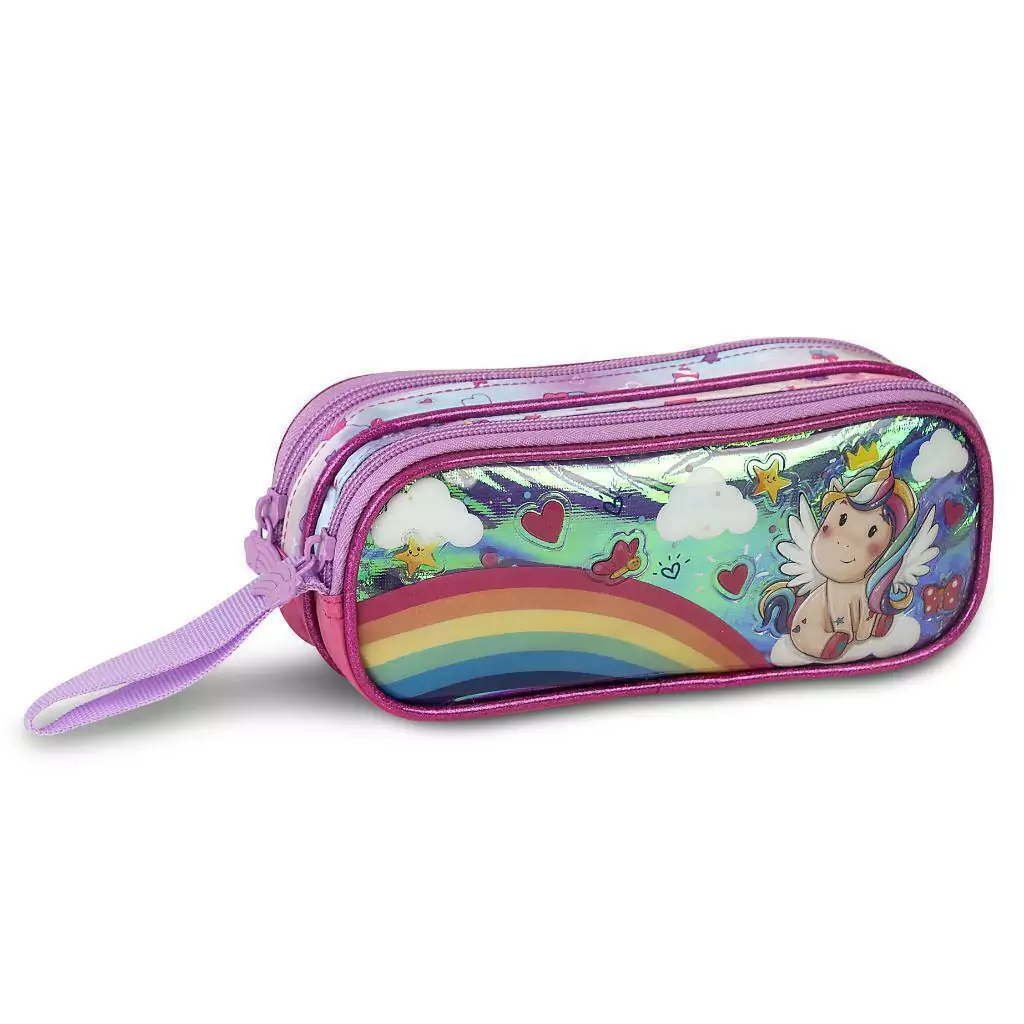 Estojo Duplo Escolar - Estojo com 2 divisórias em cetim com frente em PVC com fundo holografico. Compartimento amplo para facilitar a organização dos objetos e fechamento em zíper.