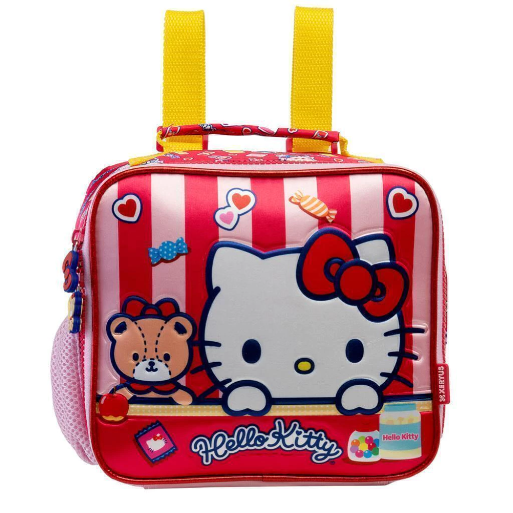 Mochila"16" Hello Kitty Xeryus - Essa mochila com rodinhas é como entrar em um mundo encantado feito de docinhos, amizade e corações saltitantes. Com um visual inspirado em uma confeitaria encantada, ela mistura listras rosa e vermelho, muitos corações e detalhes que brilham como balas coloridas! Mala em cetim com relevo, na parte da frente, a Hello Kitty aparece em pelúcia super macia, como se estivesse saindo direto de um abraço fofinho, com seu laço bordado de lantejoulas vermelhas que cintilam a cada passo. Ao lado dela, a adorável ursinha Tiny Chum acompanha a aventura, uma dupla inseparável pronta para tornar os dias escolares ainda mais doces! Rodinhas resistentes para deslizar pelo caminho da escola como quem flutua em um sonho. Haste ajustáveis, puxadores personalizados emborrachados com laços e personagens, que dão um toque divertido até na hora de abrir os compartimentos! Com essa mala, cada ida à escola se transforma numa jornada cheia de fantasia, cor e carinho. É perfeita para meninas que sonham alto, amam brilho e querem levar a Hello Kitty juntinho em todas as aventuras!
