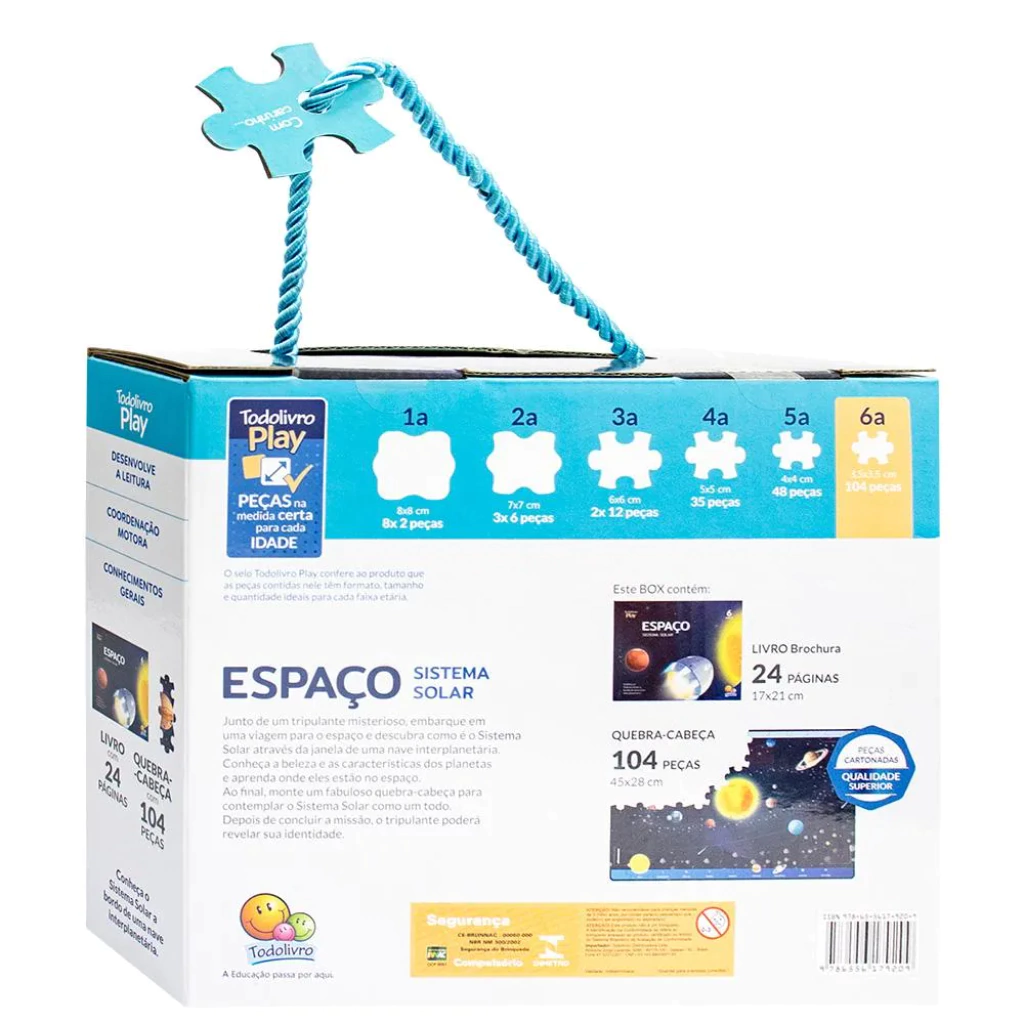 Livro INTERATIVO com Quebra cabeça Espaço Sistema Solar Todolivro - Junto de um tripulante misterioso, embarque em uma viagem para o espaço e descubra como é o Sistema Solar através da janela de uma nave interplanetária. Conheça a beleza e as características dos planetas e aprenda onde eles estão no espaço. Ao final, monte um fabuloso quebra-cabeça para contemplar o Sistema Solar como um todo. Depois de concluir a missão, o tripulante poderá revelar sua identidade. Um livro para aprender e brincar com a família e os amigos! Este Box contém: 1 Livro com 24 páginas e 104 peças de quebra-cabeças cartonadas. Brilha no escuro!