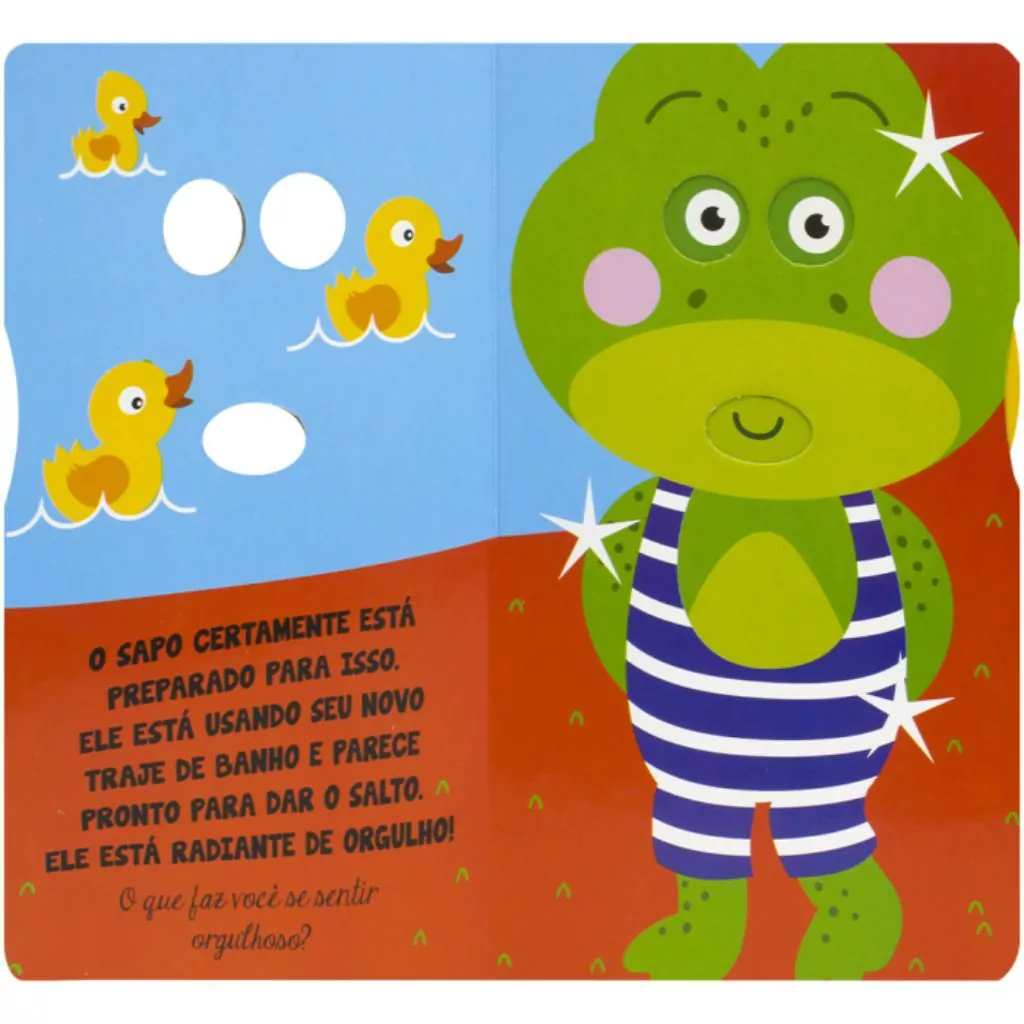 Livro Interativo sobre EMOÇÕES da Coleção Gire o Disco Todolivro - O sapo quer ir nadar hoje, mas ele tem medo de água. É um dia com muitas emoções diferentes. Gire o disco para descobrir como o sapo se sente. Você consegue demonstrar os seus sentimentos também??? As expressões faciais interativas contribuem para aumentar a compreensão infantil das emoções dos outros. Habilidades desenvolvidas: habilidades de leitura, habilidades cognitivas, emoções e sentimentos. Indicado a partir de 3 anos+